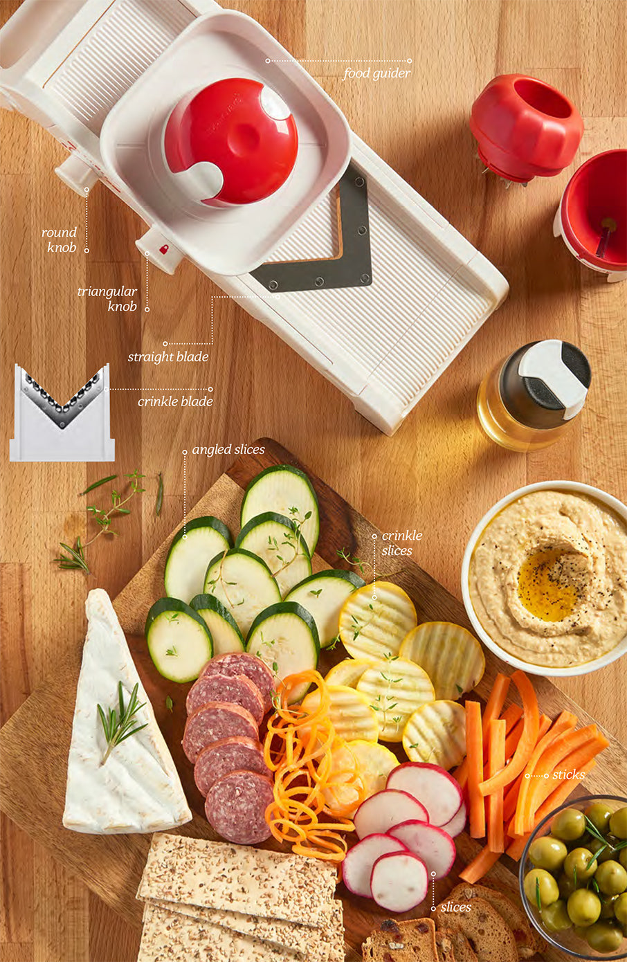 Included with each slicer are tips on how to cut eight different shapes and nine precise thicknesses. From flat slices, sticks, diamonds, and waffles to cubes, julienne, crinkle slices, and crinkle sticks, the possibilities are endless.