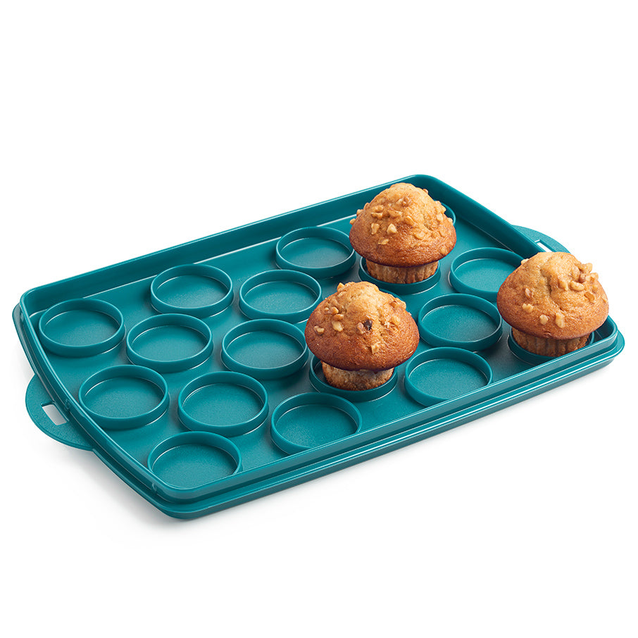 - Carry any baked goods! Large reversible tray has a flat side that can hold a sheet cake, round cake, brownies, cookies, donuts & more, while the ringed side can securely hold up to 18 cupcakes.