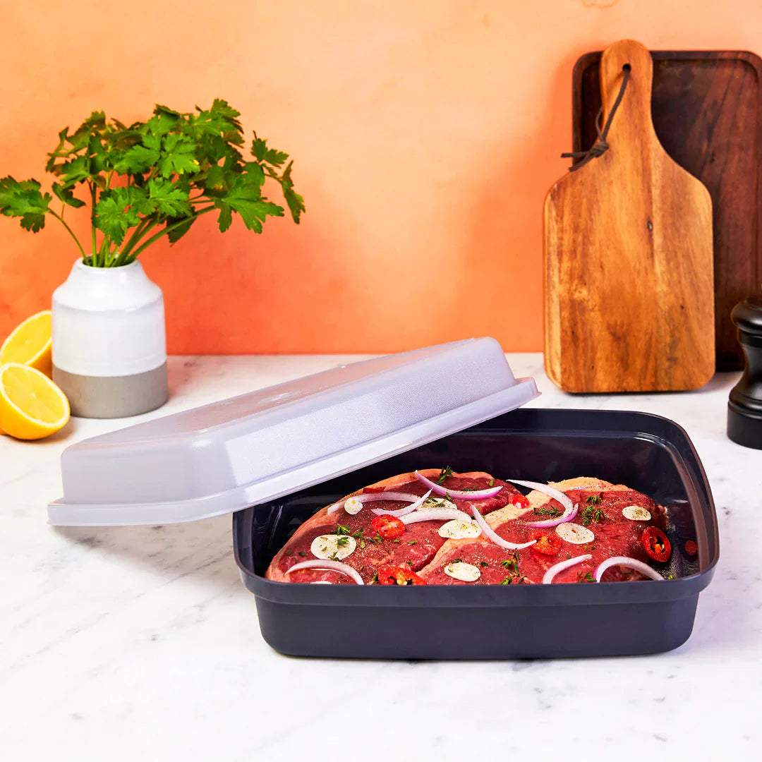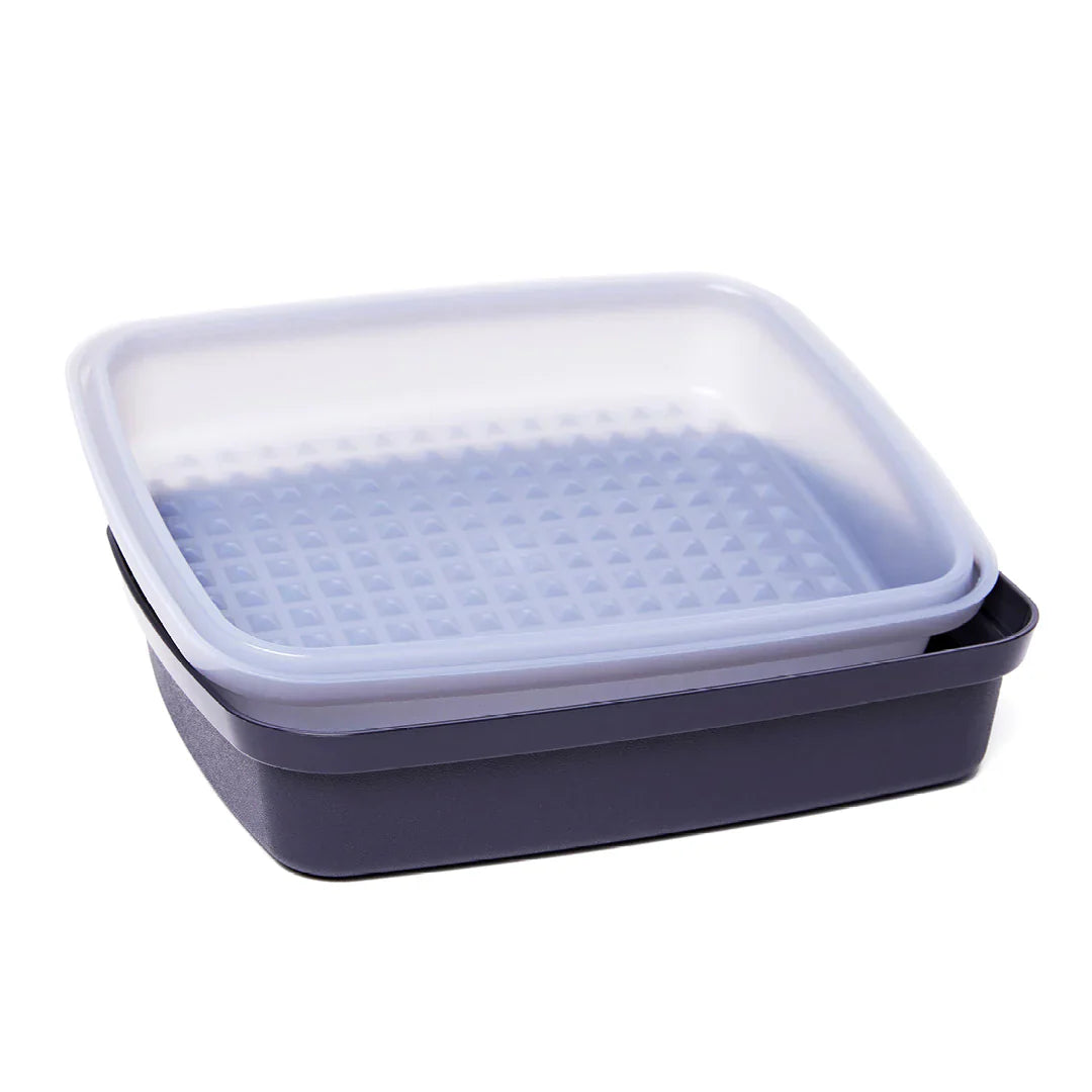 Also known as the famous marinator. Prepare and serve lamingtons and slices, sweets and savoury! Store in the cupboard, benchtop, fridge or freezer. Unique grid design on both the base and the Seal allows marinade to circulate around the contents. Simply press the centre of the Seal then release each of the four corners and fill with your favourite foods. The high domed seal provides extra space. The handy gripping area on the rim and base gives you the confidence to hold and flip to distribute marinade. Classic sheer base allows you to easily identify the contents. Ideal for marinating, flouring, crumbing or storing meats and vegetables. Simply press the centre of the Seal then release each of the four corners. Seal IS NOT completely liquid-tight, therefore care must be taken and hold the container over the sink while turning.